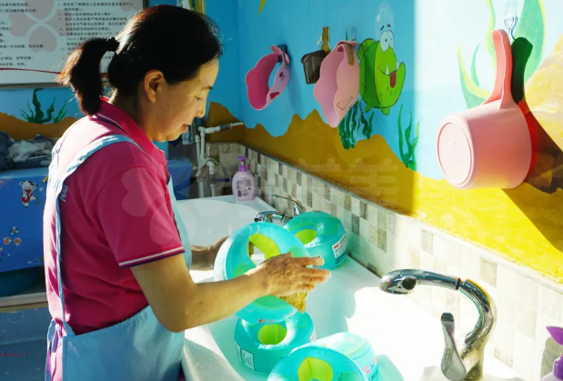 △烏蘭美水育中心的工作人員正在做消毒清洗工作